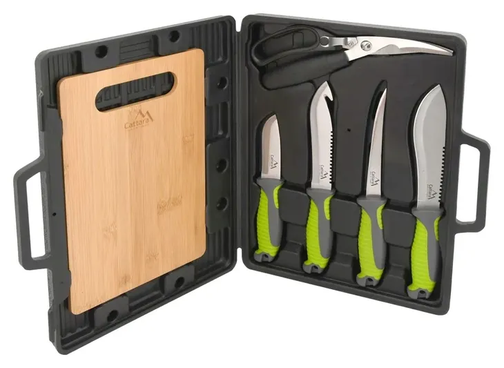 Zestaw do grillowania składający się z 4 noży, nożyczek do drobiu i ryb oraz deseki do krojenia dla wygodnego porcjowania. Mały, średni, duży i filetujący nóż wykonany jest z wysokiej jakości stali nierdzewnej z plastikowym, ergonomicznie ukształtowanym uchwytem z gumowaną powierzchnią. Zestaw zawiera również praktyczne nożyczki do drobiu lub ryb z przesuwanym zamkiem. Są wyposażone w szeroki uchwyt do wygodnego trzymania i późniejszego porcjowania. Nożyczki są wykonane z wysokiej jakości stali nierdzewnej, podobnie jak noże. Kolejnym elementem zestawu jest bambusowa deska do krojenia do wygodnego krojenia. Cały zestaw jest starannie umieszczony w walizce transportowej. Z zestawu można korzystać zarówno w domu, w ogrodzie, jak i na drodze.